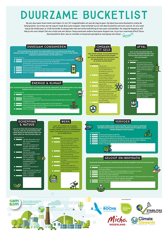 Bekijk de Duurzame Bucketlist hieronder. Klik erop om hem te vergroten of te downloaden. Zie ook duurzamebucketlist.nl